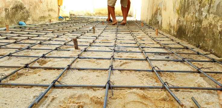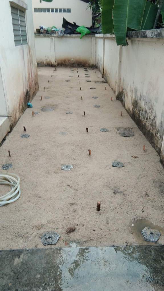 หลังจากลงเสาเข็มหกเหลี่ยม แบบปูพรมเรียบร้อยครับ ปรับระดับพื้นด้วยทรายหยาบ ผูกเหล็ก 9 มม. เสร็จ เตรียมตัวเทปูนได้เลยครับ