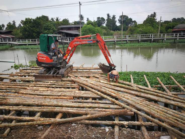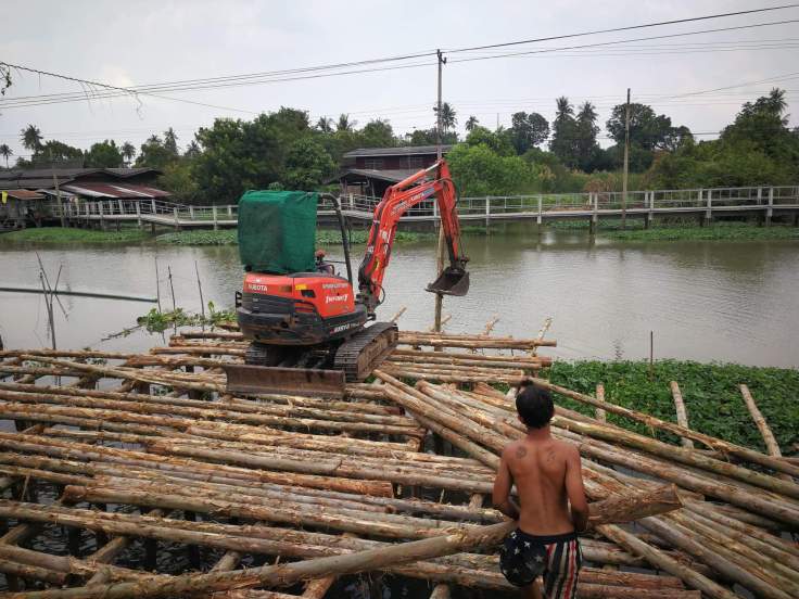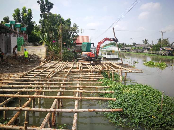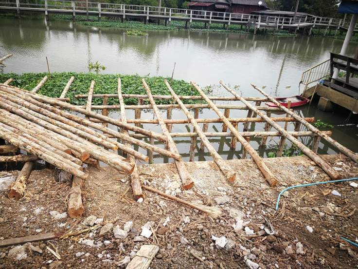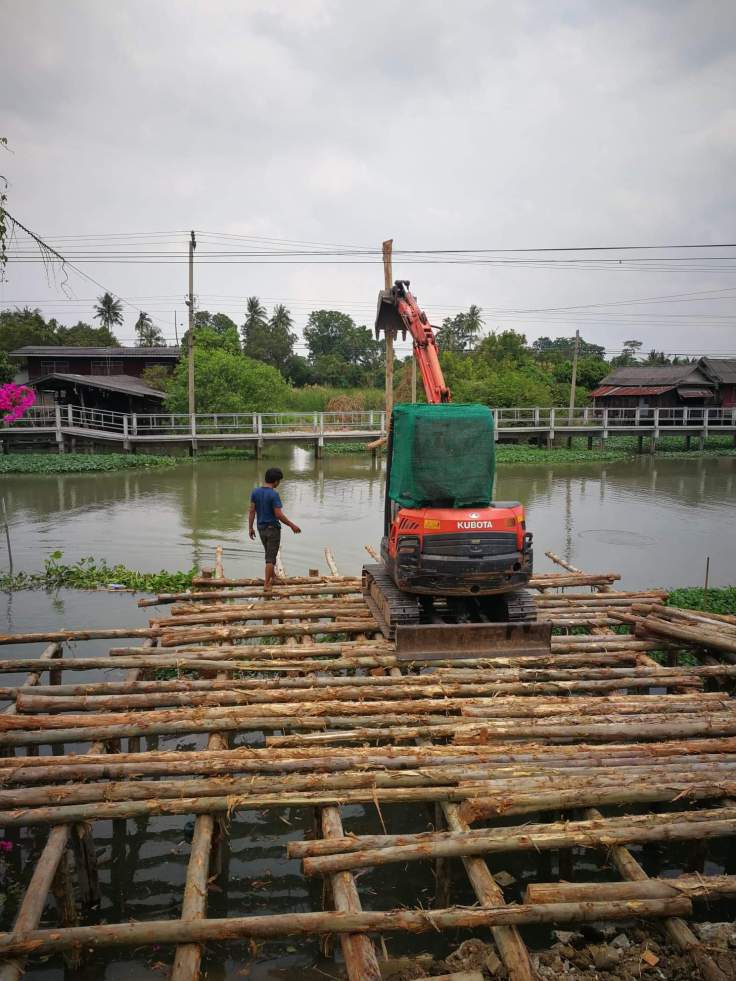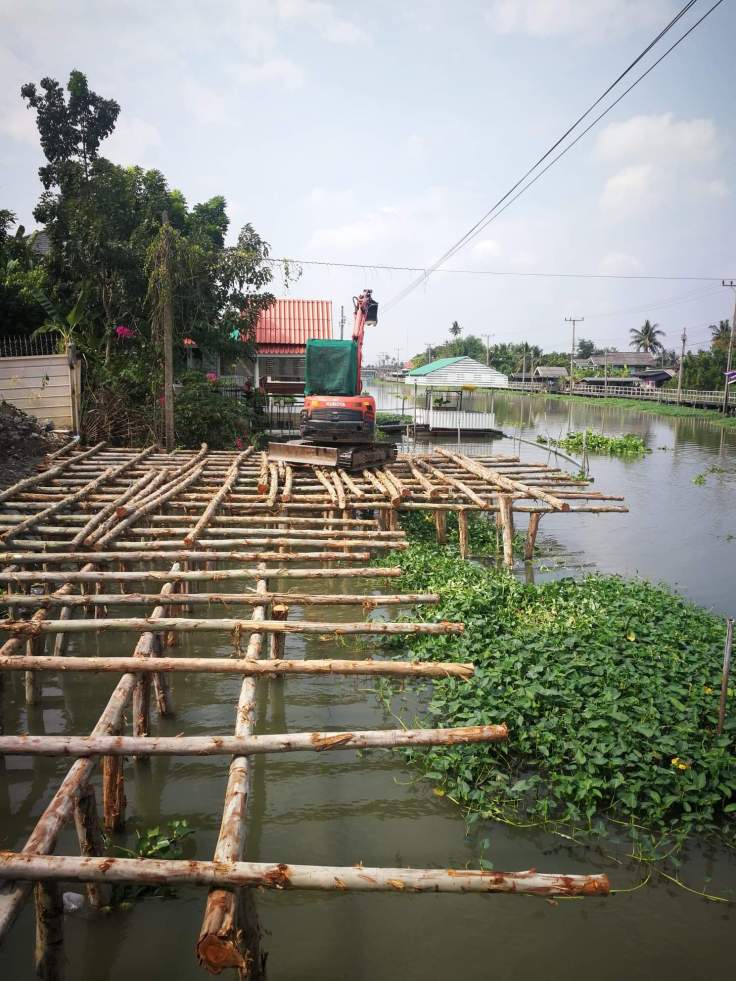เนื่องจากหน้างานนี้ นอกจากการทำเขื่อนริมคลองแล้ว ยังมีภาระกิจในการสร้างท่าเรือ และจำเป็นที่ต้องตอกเสาเข็ม I 0.26 ในน้ำ ทีมงานจึงต้อง เตรียมนั่งร้าน เพื่อให้ทีมตอกเสาเข็ม สามารถตอกเข็มได้ครับ นั่งร้าน ทำด้วยเข็มไม้ยูคา ขนาด 6 นิ้ว ยาว 6 เมตร ครับ