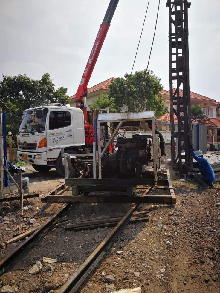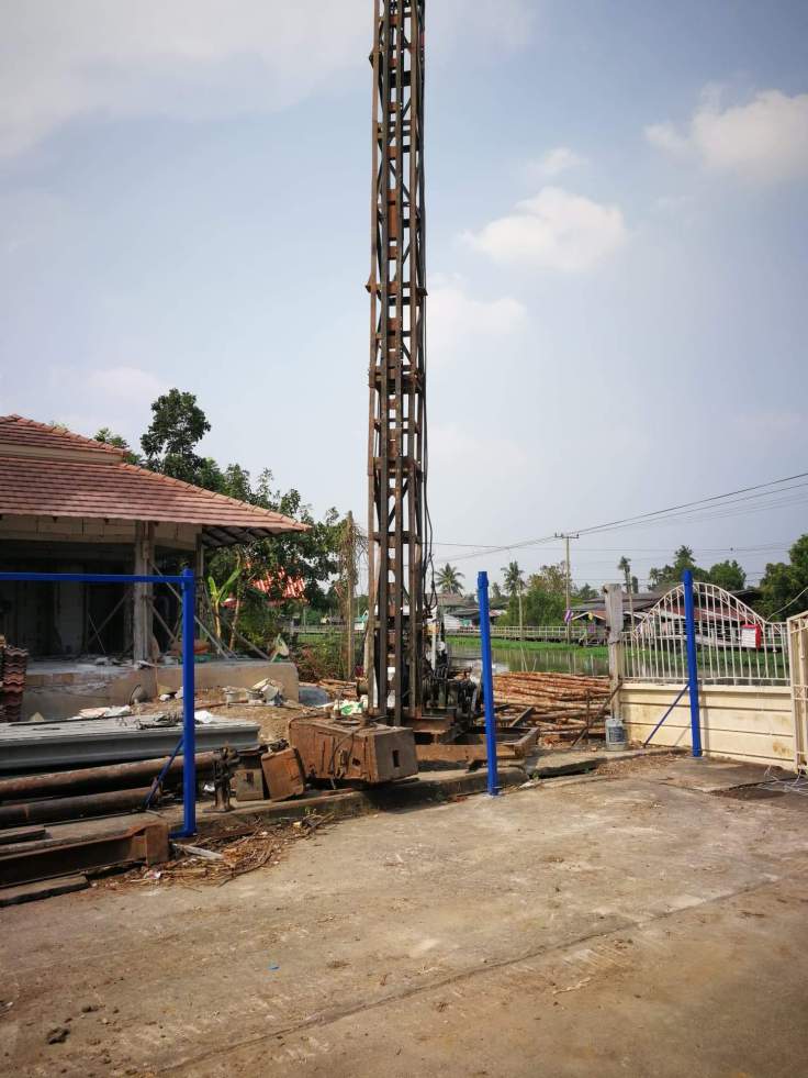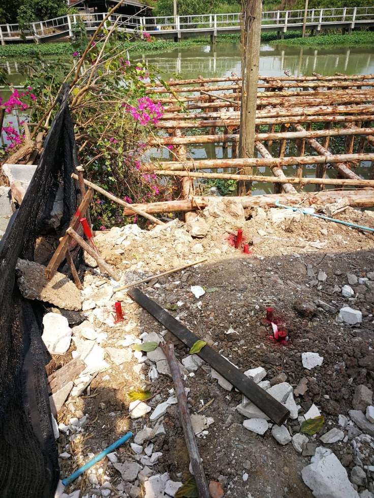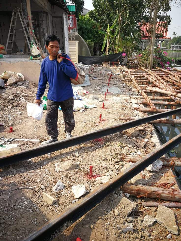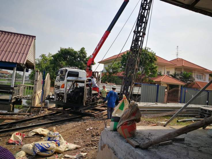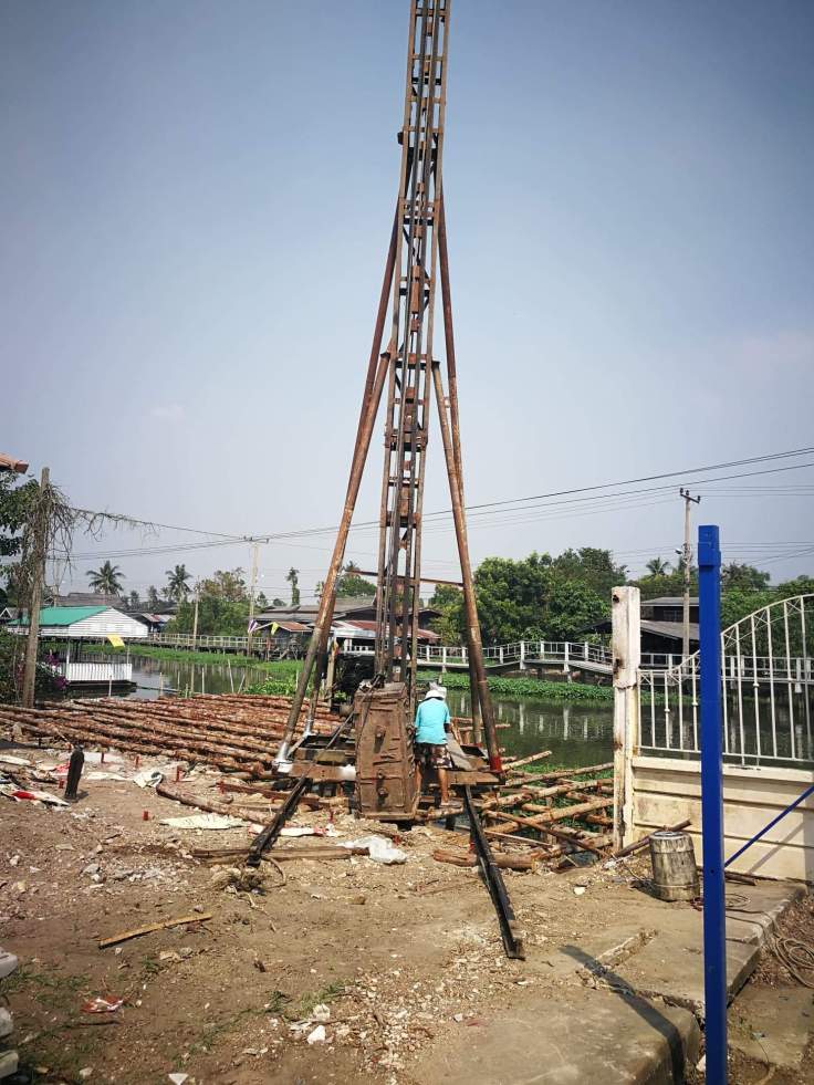 งานก่อสร้าง เขื่อนริมคลอง และก่อสร้างท่าจอดเรือ หลังจากทีมงานตั้งนั่งร้านเพื่อให้ปั้นจั่นได้ยืนตอกเสาเข็ม เป็นเสาเข็มไอ 26 หน้างานวันนี้เริ่มงานตอกเสาเข็มวันแรกครับ