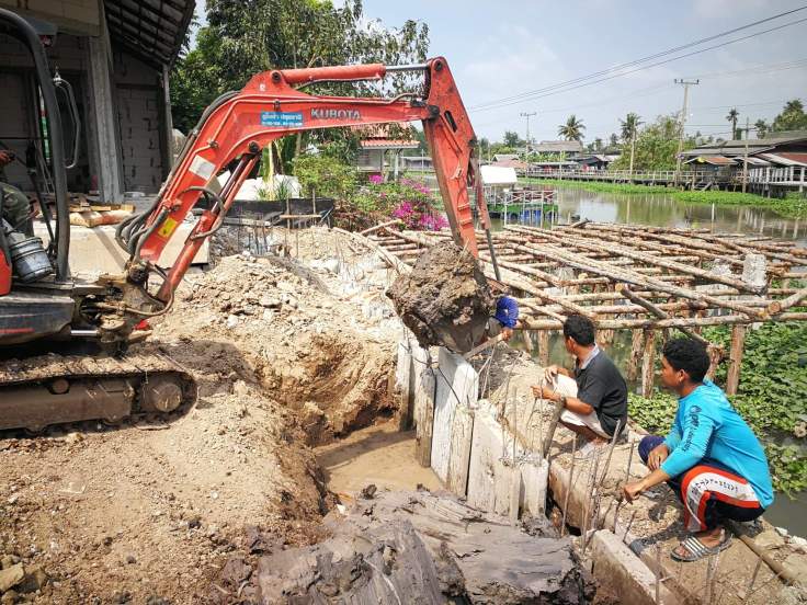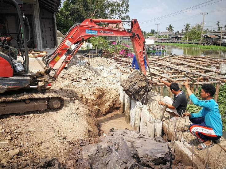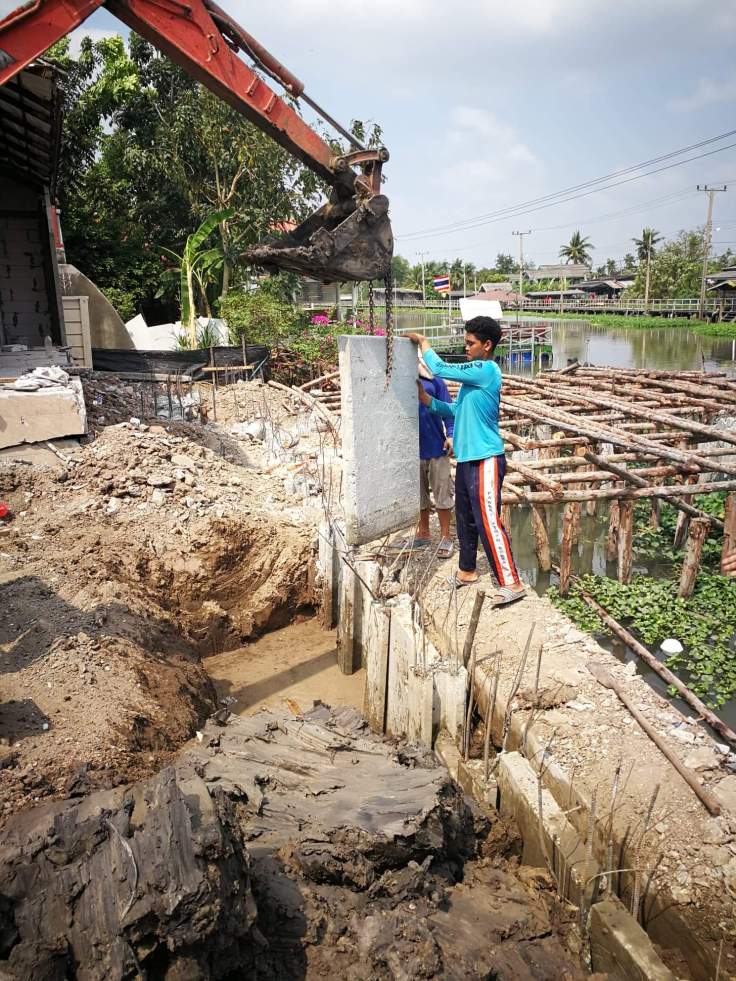 ซึ่งในภาพ เนื่องจากหน้างานมีพื้นที่การทำงานค่อนข้างจำกัด ทำให้การทำงานอาจจะมีอุปสรรคอยู่บ้าง แต่สุดท้าย ภาระกิจการเสียบแผ่นคอนกรีต เพื่อทำผนังกันดินก็เสร็จเรียบร้อยครับ