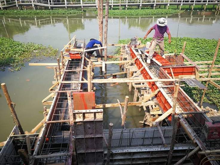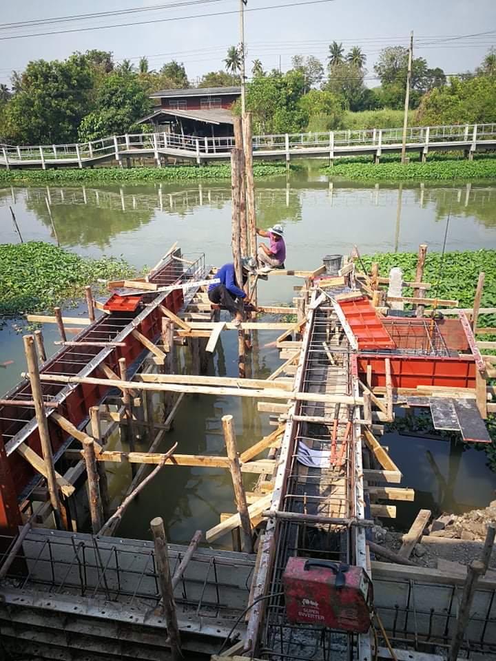 งานก่อสร้าง เขื่อน และท่าเรือ ซึ่งหน้างานเป็นบ้านริมคลองครับ วันนี้ เป็นผูกเหล็ก ตีไม้แบบ ก่อนเทคาน ซึ่งมีคานหลายขนาด เช่น 45×45 cm 45×40 cm. 20×40 cm. ครับ ความยาวของคานทั้งหมด ประมาณ 53 เมตร ครับ