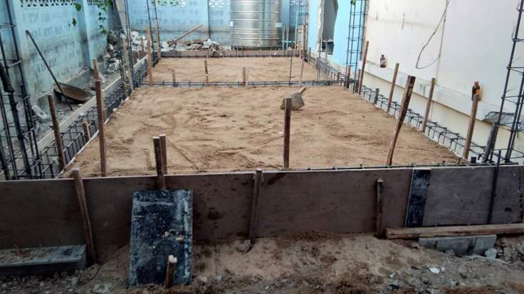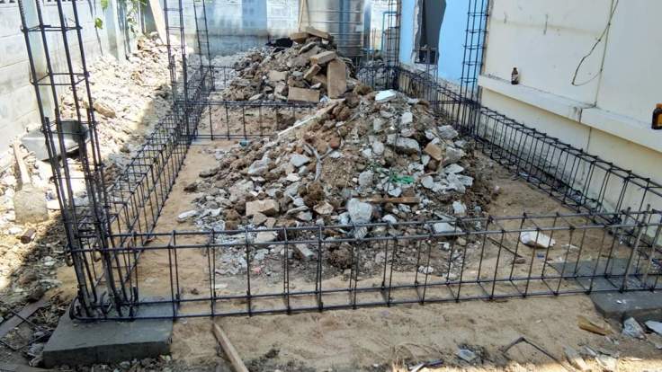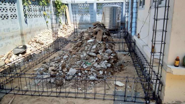 การต่อเติมครัวหลังบ้าน ทำเป็นสองชั้น หลังจากทุบครัวเดิมแล้วเสร็จ และเริ่มทำงานใหม่ ด้วยงานฐานราก เริ่มจากการลงเสาเข็มไมโครไพล์ 6 ต้น ทำฟุตติ้ง เทคาน เทพื้น เตรียมงานในขั้นตอนต่อไป