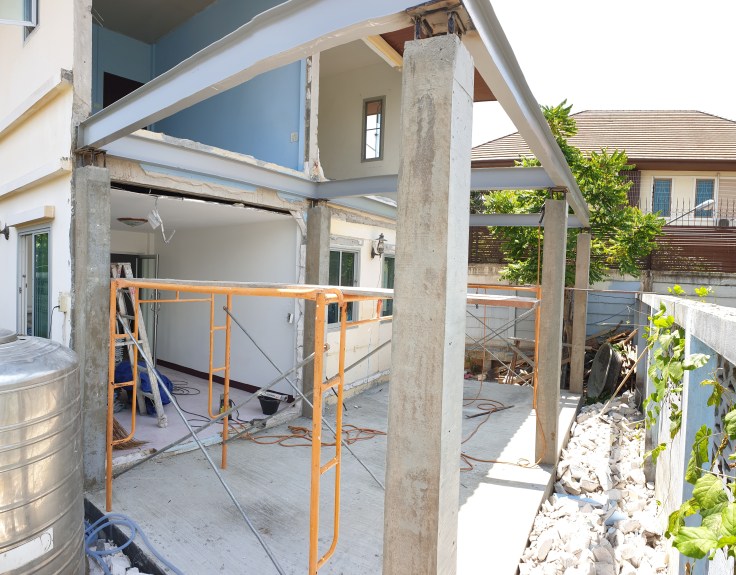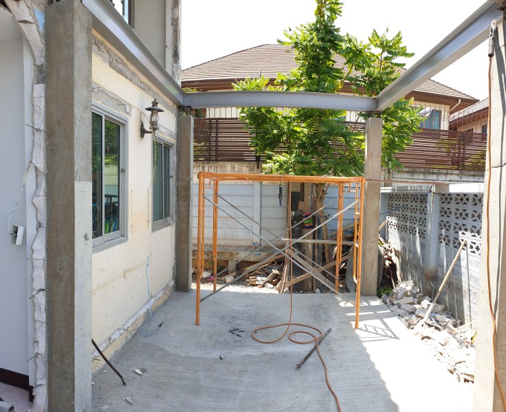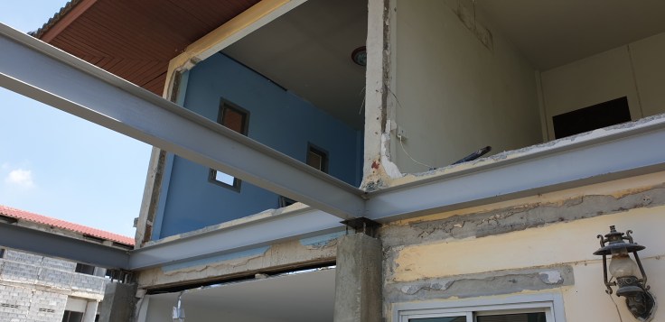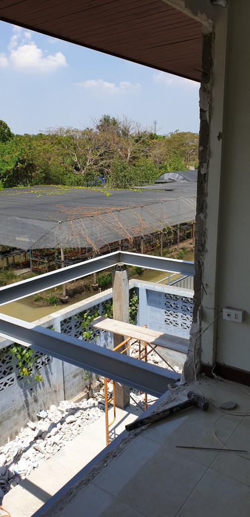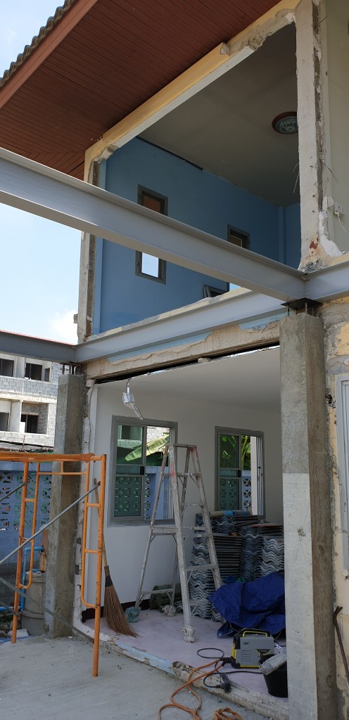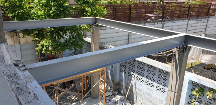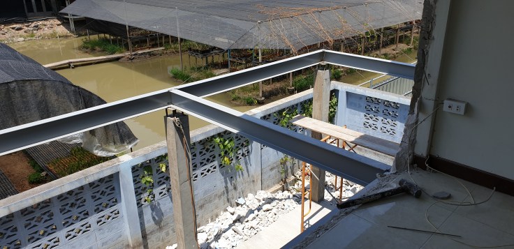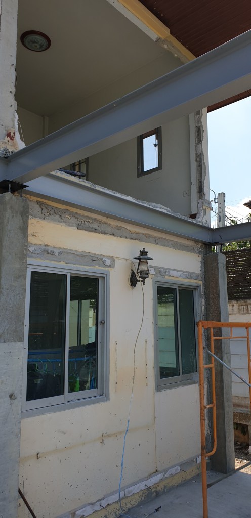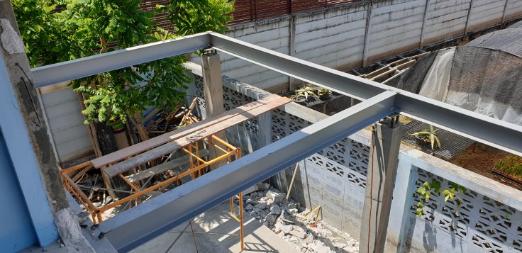 งานต่อเติมครัวหลังบ้าน เป็น อาคารสองชั้นด้วยโครงสร้างเหล็ก หลังจากที่ ทุบครัวเก่าออกไปแล้ว ลงเข็ม ทำงานฐานรากเสร็จ วันนี้ หน้างานที่ถ่ายรูปมา เป็นงานตั้งเสาคอนกรีต คานเหล็ก H Beam เป็นงานต่อเติมเป็นสองชั้น เชื่อมพื้นที่ บ้านใหม่ กับ บ้านเก่า แต่แยกโครงสร้างกันนะครับ