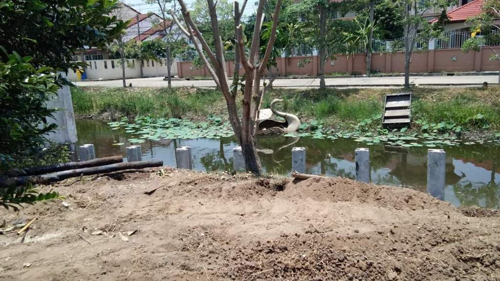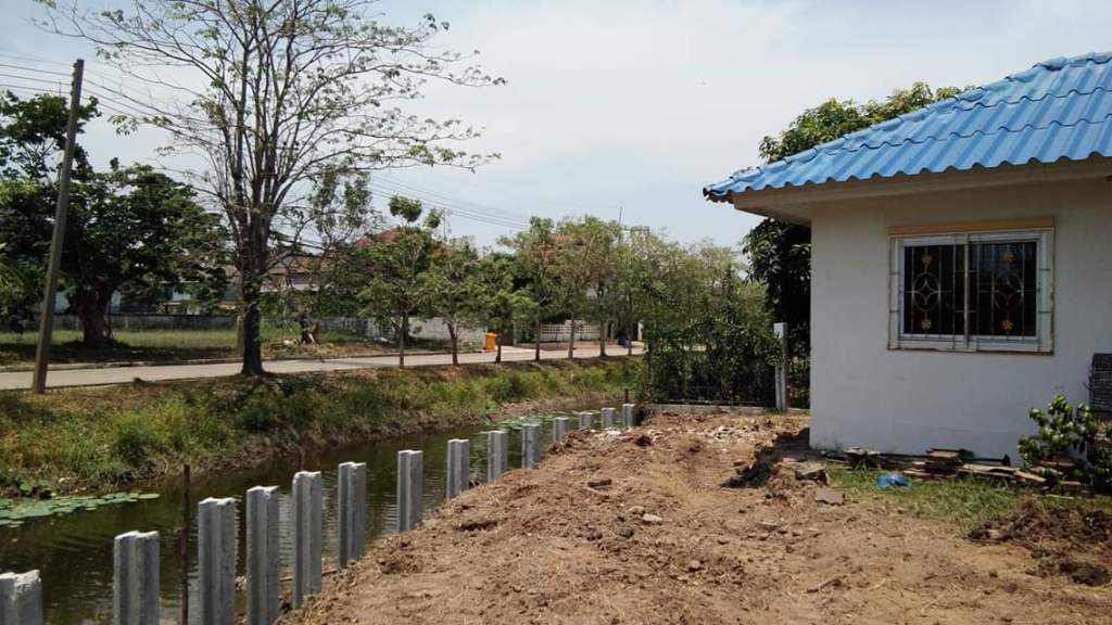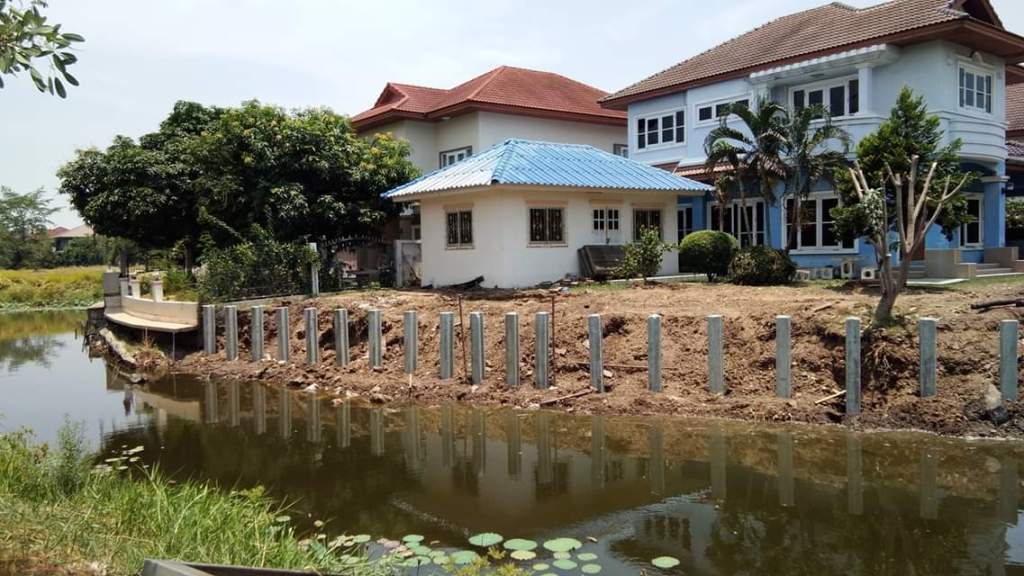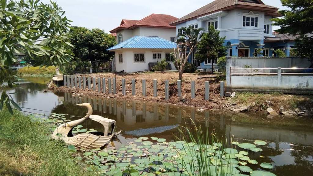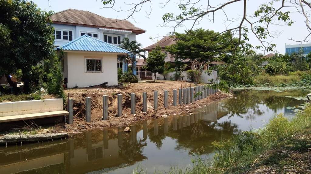 ปัญหาของหน้างานนี้ คือ รั้วบ้านด้านติดน้ำ มีปัญหารั้วเอียง และล้ม เนื่องจาก น้ำในบึงแห้ง จนทำให้เกิดปัญหา กำแพงกันดินเก่าล้ม ทีมงานเรา เข้าดำเนินการ ทำการลงเข็ม เพื่อก่อสร้างเขื่อนใหม่ครับ