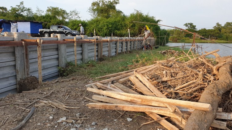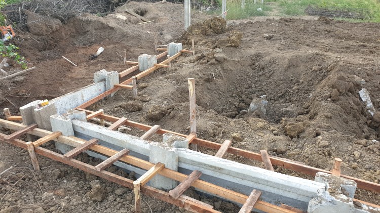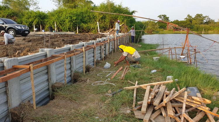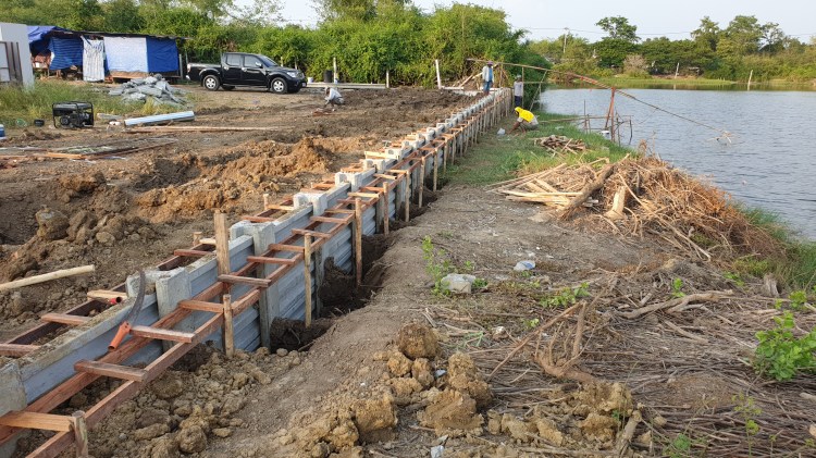 เสียบแผ่น ผนังกันดิน 6 แผ่น ยาวช่องละ 1 เมตร กำแพงกันดิน ยาว 40 เมตร เสร็จเรียบร้อย หน้างานวันนี้ ตีไม้แบบ ทำตุ๊กตาท้องคาน เตรียมผูกเหล็ก เทคาน ในลำดับงาน ถัดไปครับ