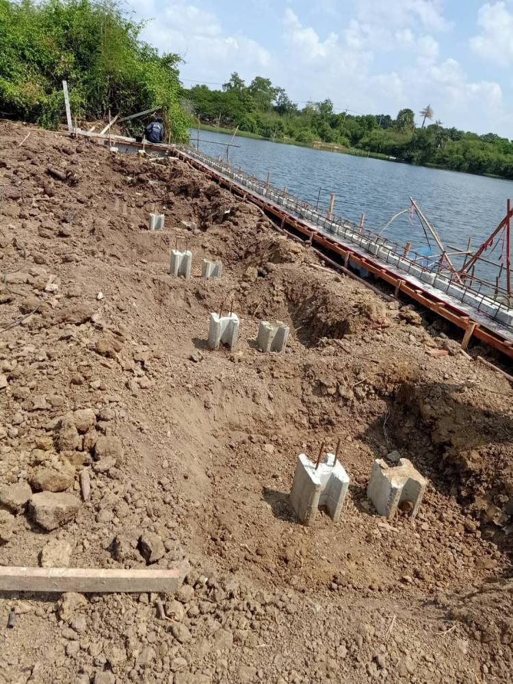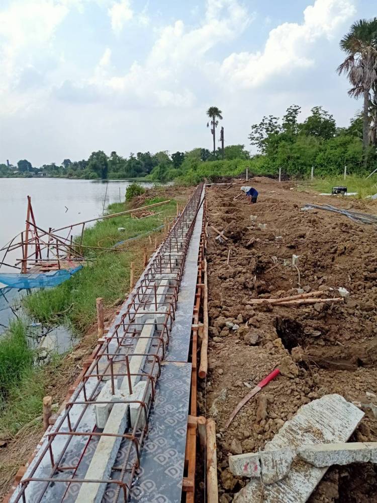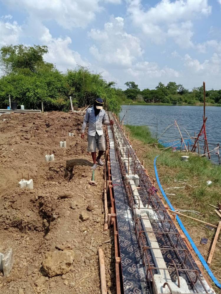 งานก่อสร้างเขื่อน กำแพงกันดิน ยาว 40 เมตร สำหรับขั้นตอนนี้ เป็นงาน ผูกเหล็กคาน ตีไม้แบบ ท้องคาน เตรียมเทคาน ในลำดับงานต่อไปครับ