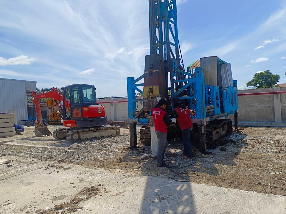 การตอกเสาเข็มเป็นงานที่ต้องใช้ความแม่นยำและความชำนาญอย่างมาก ทีมวิศวกรและโฟร์แมนของเราที่มีประสบการณ์การทำงานมากกว่า 20-30 ปี ได้เริ่มต้นด้วยการวางผังและกำหนดตำแหน่งของเสาเข็มในแต่ละหลุม หลุมทั้งหมดมี 10 หลุม โดยแต่ละหลุมจะมีเสาเข็ม 2 ต้น ขนาดของเสาเข็มคือ 22×22 เซนติเมตร ยาว 20 เมตร